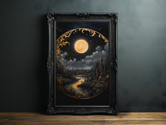 Enchanting Celestial Moon Art Print - Vintage-Inspired - Dark Academia, Dark Cottagecore, Night Sky Painting, Moon Art Print